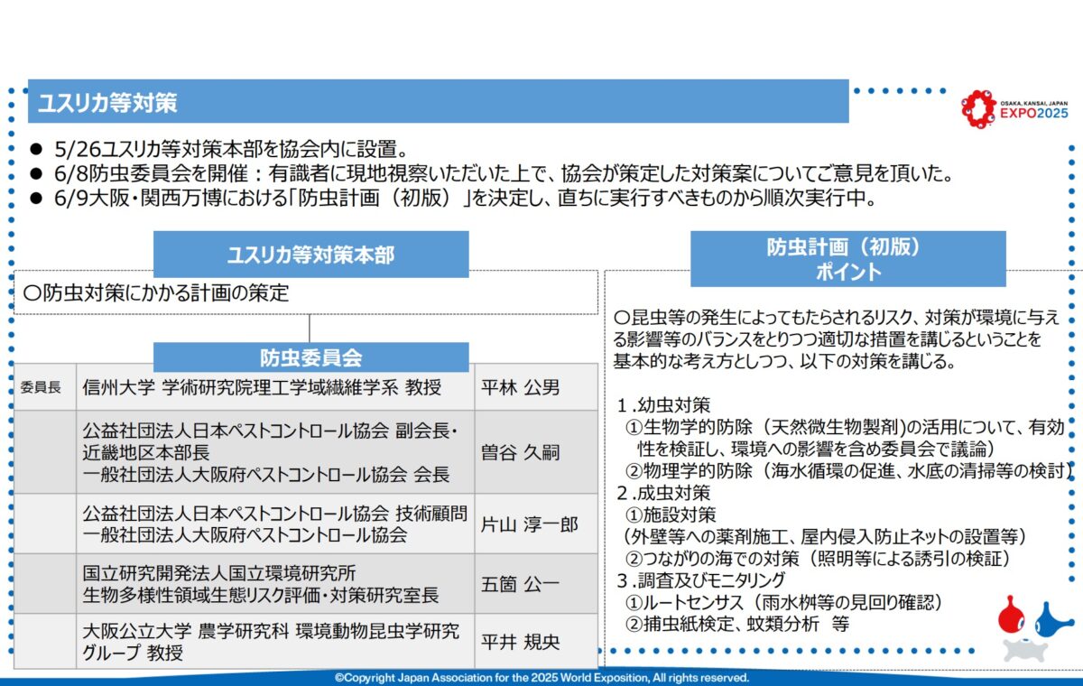 また、(公社)2025年日本国際博覧会協会のユスリカ等対策本部に設けらえた防虫対策委員会に、ペストコントロール協会メンバーが委員として参画しております。